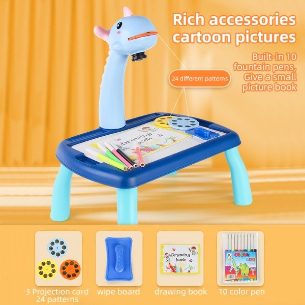 Inciuye 3 discos con dibujos, marcadores al agua, borrador, papeles y una plancha reutilizable para pintar y borrar.