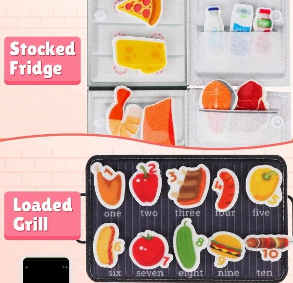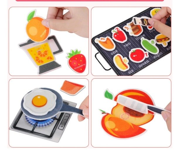 Este libro de tela de felpa, lleno de imágenes de cocina con velcro, está diseñado para ayudar a los niños pequeños a desarrollar habilidades cognitivas esenciales.
