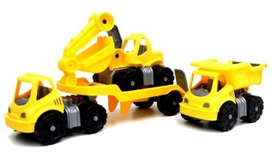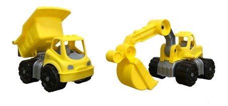 Fantástico set de camión volcador + excavadora con pala mecánica articulada.