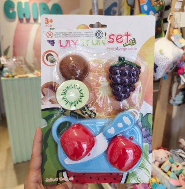 Contiene un cuchillo de plástico sin filo, 1 tabla de corte, 1 platito y 3 frutas/ verduras con velcro en el centro para mayor diversión.